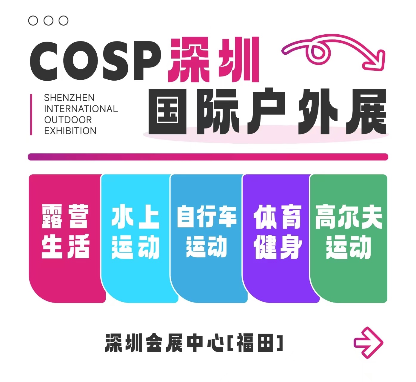COSP深圳国际户外展(简称COSP2026)将于2026年3月20-22日在深圳会展中心隆重召开!将户外与大自然搬到展馆中,将娱乐休闲与产业交易巧妙融合,现场直击户外与城市的碰撞,自然与潮流的摩擦,展示范围覆盖全时、全季、全龄、全景的户外品类,可实现各种无限大胆的想法,给予到场观众独一无二的沉浸式户外体验,也为户外产业搭建起一座交流合作的桥梁。本次展会围绕“引领生活新方式”为主题展开,打造一场户外行业盛会,让大家享受到一份属于自己的美好户外生活!