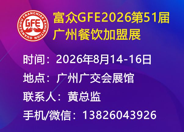 “富众GFE2026第51届广州国际餐饮加盟展”将于2026年8月14-16日在广州琶洲展馆举办,诚邀各餐饮连锁加盟企业参展。
